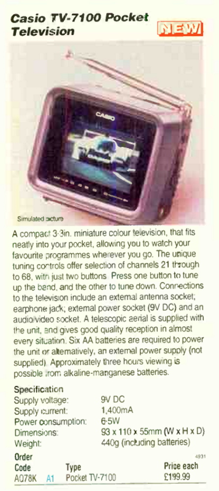 Im Maplin Catalog 1994/1995 wurde der TV-7100 für knapp 200 Pfund angeboten, das waren damals umgerechnet rund 500 DM. In Japan war er auch in einem echt feschen grün erhältlich.