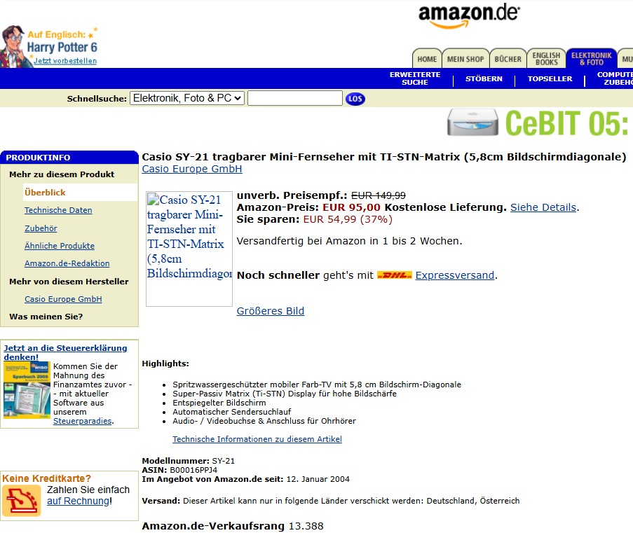 Fernsehen am Strand? Wasser und Sand können diesem schicken CASIO SY-21 aus dem Jahr 2002 relativ wenig anhaben. Bedauerlicherweise kommt das ansonsten recht ordentliche Display gegen helles Sonnenlicht nicht an, sodass man das Gerät besser zum night swimming mitnimmt. Grundsätzlich ist der SY-21 aber ein erfreulich pfiffiges Gerät, dass sich hinsichtlich Farbe und Design wohltuend vom üblichen Einerlei absetzt. Im Rahmen der Werbekampagne CASIO in Motion wurde das Gerät denn auch umfassend beworben: "Für den perfekten Komfort im Urlaub gibt es eine handliche Quelle für Information und Unterhaltung ...".