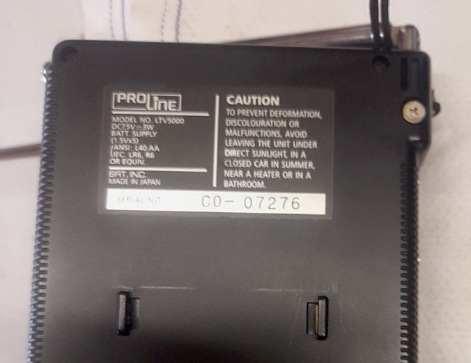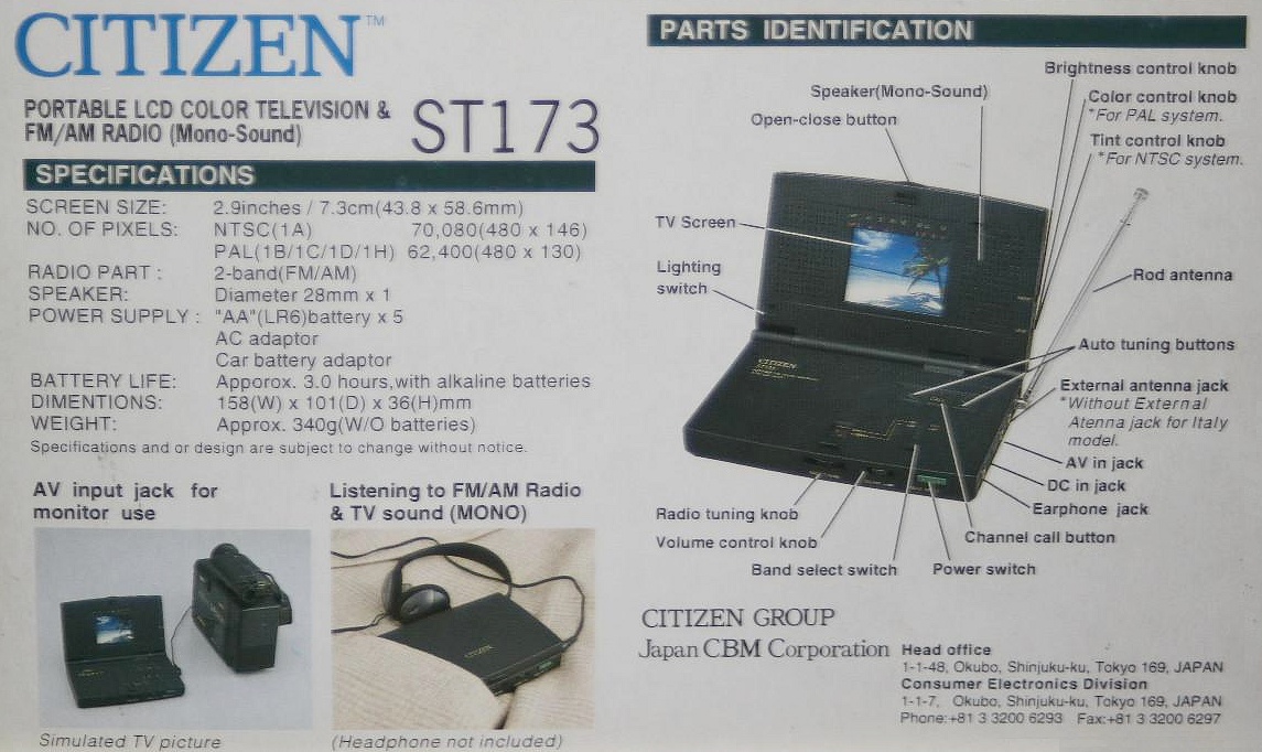 Der Rest ist Mittelklasse: 69-mm Display (PAL: 62.400 Elemente, NTSC: 70.080 Elemente), A/V-Eingang, Helligkeits- und Farbkontrastregler. Einen Antennenanschluss gibt's u.a. in der abgebildeten Version für USA (ST173-1A), nicht jedoch in der Ausführung für Italien. Die Leistungsaufnahme meines ST173 beträgt laut Typenschild 2,8 Watt, mit 5 Mignon-Akkus ist er knapp 450 Gramm schwer. Made in Japan.
