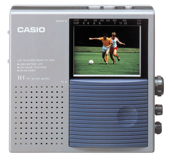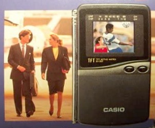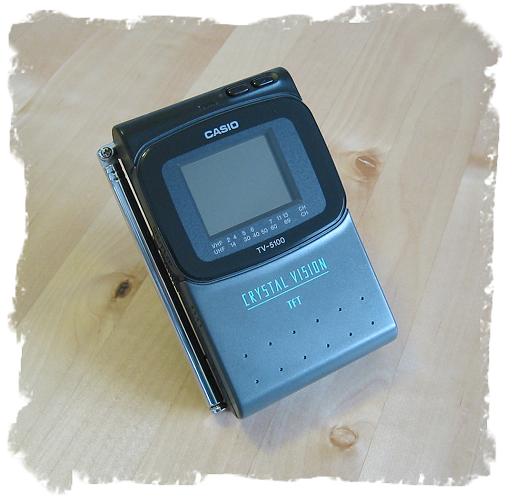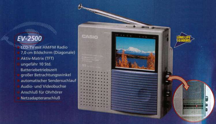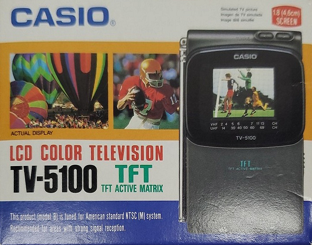 Ein Modell aus den Anfangsjahren der TFT-Displays ist dieser CASIO TV-5100. Ohne Zweifel ein Vorläufer der erfolgreichen Baureihe EV-5x0: Klein, leicht und ordentlich ausgestattet (z.B. mit einer A/V-Buchse). Für Sammler sicherlich interessant: 1994 gab es mehrere Ausführungen des TV-5100 zur NASCAR-Promotion. Da dem Produzenten dieser Sonderedition aber die erforderliche Lizenz fehlte, musste der Restbestand vernichtet werden (Quelle: Marty Bunis, Collectable Transistor TVs).