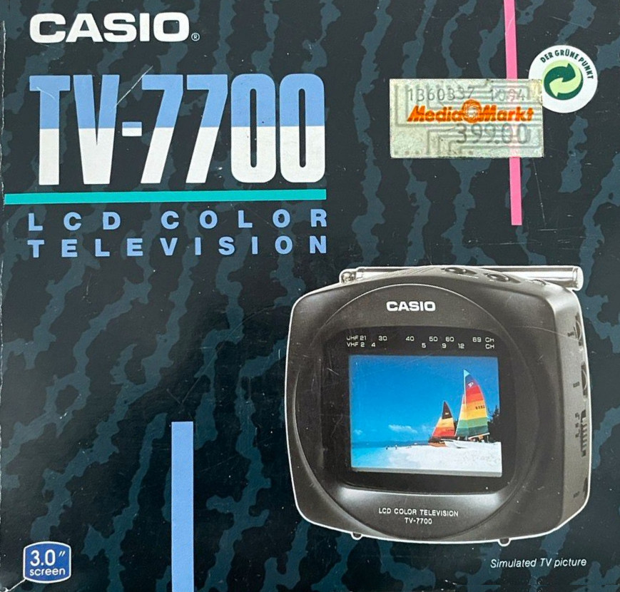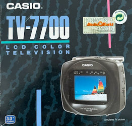 Ein hochwertiger Aktivmatrix-Bildschirm mit 3 Zoll gleich 76 mm Diagonale in einem unkonventionellen Gehäuse - das ist der CASIO TV-7700. Leider bemüht der Prospekt für den 7700er einmal mehr das Thema Sport, obwohl es oft keine große Freude ist, eine Sportübertragung mit einem Taschenfernseher zu verfolgen - selbst wenn dieser über ein TFT-Display verfügt.