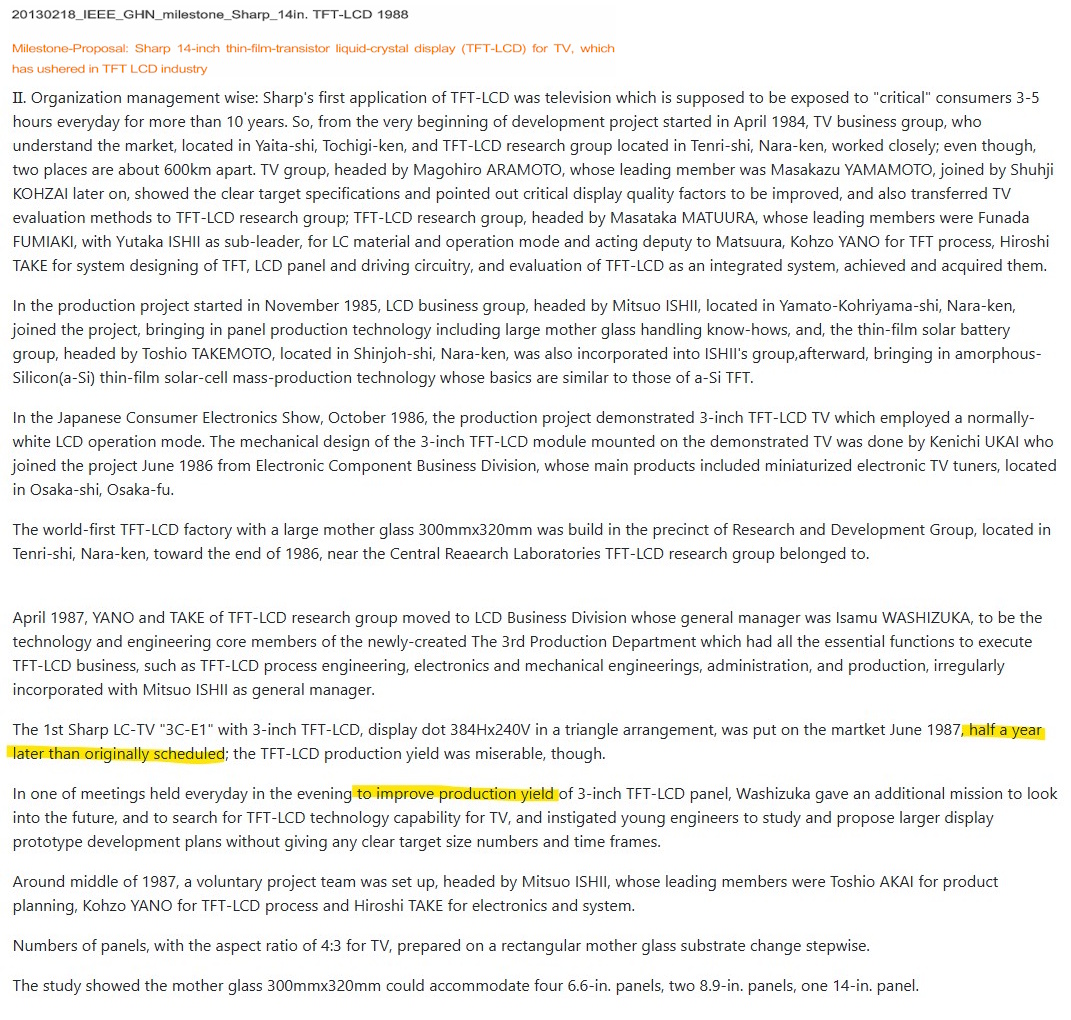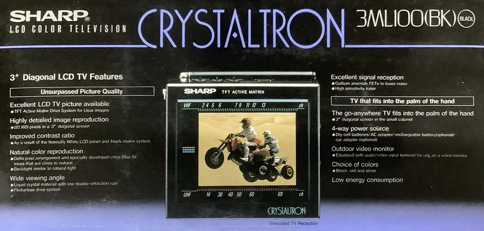 Im Jahr 1987 betrat Sharp die Bühne der TFT-Produzenten und startete mit dem Minifernseher Sharp 3C-E1 „Crystaltron“ und einem 3-Zoll-TFT mit 92.160 Pixel - das war damals Rekord. Im Internet findet man dazu sogar ein paar Informationen, beispielsweise, dass bereits 1986 ein Prototyp des Displays auf der Japan Electronics Show gezeigt wurde und man sich auf lebendige Farben freuen kann. Verschiedenen Quellen zufolge sei jedoch die Ausbeute bei der Displayproduktion recht bescheiden gewesen, sodass der 3C-E1 in Japan erst mit einem halben Jahr Verspätung auf den Markt kam.