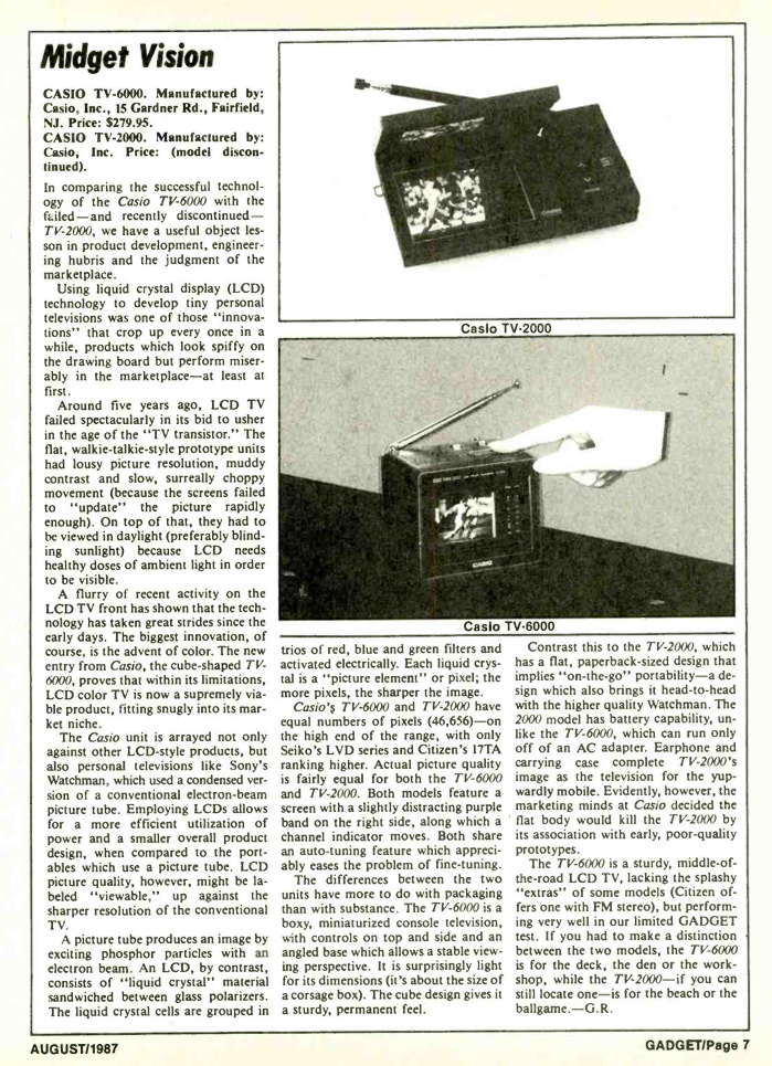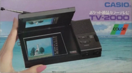 Im Mai 1985 ging in Japan der CASIO TV-1000 an den Start, der erste Fernseher mit Farb-LCD aus dem Hause CASIO. Die Qualität des Displays (64 mm Diagonale) ist zwar alles andere als beeindruckend, aber der Aufbau ist wirklich trickreich: Die Leuchtstoffröhre zur Hintergrundbeleuchtung sitzt am unteren Rand des Displays und das dahinterliegende Batteriefach kann auf Knopfdruck weggeklappt werden (siehe Bild links). Dadurch ist der TV-1000 (alias Realistic Pocketvision 20, das ist eine Marke von Tandy) auch bei Sonnenlicht einsetzbar. Mit den Massen 161 * 83 * 36 mm zählt er nicht gerade zu den kleinsten Taschenfernsehern. Erstmals in Deutschland war er vermutlich auf der Internationalen Funkausstellung in Berlin vom 30. August bis zum 8. September 1985 zu sehen.