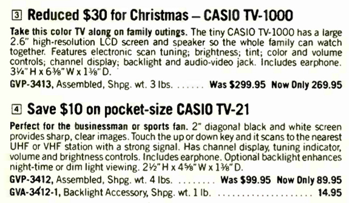 Gemäß einer Leserzuschrift wurde der TV-1000 hierzulande Anfang 1987 für den stolzen Preis von rund 850 DM verkauft, wahlweise auch in Silber. In Österreich wurde er im Sommer 1986 für knapp 8.000 Schilling angeboten, das entsprach damals über 1.100 DM (vielen Dank an Robert Kacsich für den Scan!). Der Neupreis des TV-1000 in den USA lag bei rund 300$, im Weihnachtsgeschäft 1985 30$ darunter. In Australien waren vermutlich rund 400 AUD fällig, in Japan 58.000 Yen (= 700 DM). Das steht auch am Ende dieses sehr kurzen, aber putzigen Werbespots.