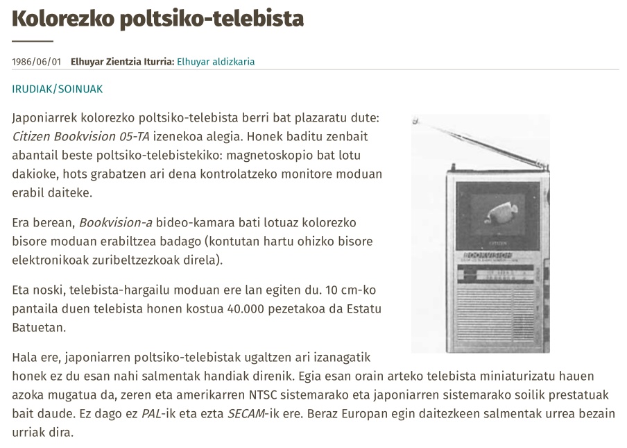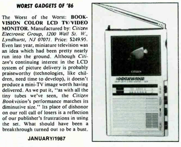 Bücher waren gestern, heute stehen bewegte und kommentierte Bilder im Vordergrund: Im Juni 1985 erschien der CITIZEN 05TA, besser bekannt unter der Bezeichnung Bookvision. Der 05TA hat in etwa das Format einer VHS-Videokassette, passend dazu lag dem Gerät eine "Plastikleder" Hülle mit Klettverschluss bei, die offenbar für's Bücher- oder Videokassettenregal gedacht war. Die Ausstattung des 05TA ist umfassend, beispielsweise kann alternativ zur integrierten Hintergrundbeleuchtung eine externe Lichtquelle zum Einsatz kommen - dazu wird einfach die Rückwand weggeklappt. Ein A/V-Eingang ist vorhanden (3,5 mm), eine externe Antenne kann mittels eines beigelegten Antennenclips angeschlossen werden.