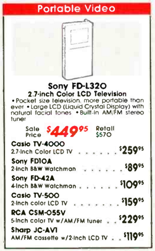 Wenn mich meine Unterlagen nicht trügen, gab's das Gerät für den japanischen Markt in einer Version mit DOLBY-B Rauschunterdrückung als Sharp JC-TV10 (die rechten drei Bilder oben) in den Farben rot, schwarz und weiß zum Preis von 48.000 Yen. Das waren damals rund 590 DM. Diese Fotos des JC-TV10 stammen von Paul Zurek, einem Taschenrechner- und Walkmansammler aus Connecticut/USA. In Deutschland war meines Wissens leider keines der Modelle erhältlich. Meine oben links abgebildete Ausführung JC-AV1E(R) wurde für den britischen Markt konzipiert und empfängt daher nur TV-Programme im UHF-Band (TV-Standard "I"). In den USA wurde der JC-AV1 im Dezember 1988 schon deutlich reduziert für knapp 120$ angeboten.