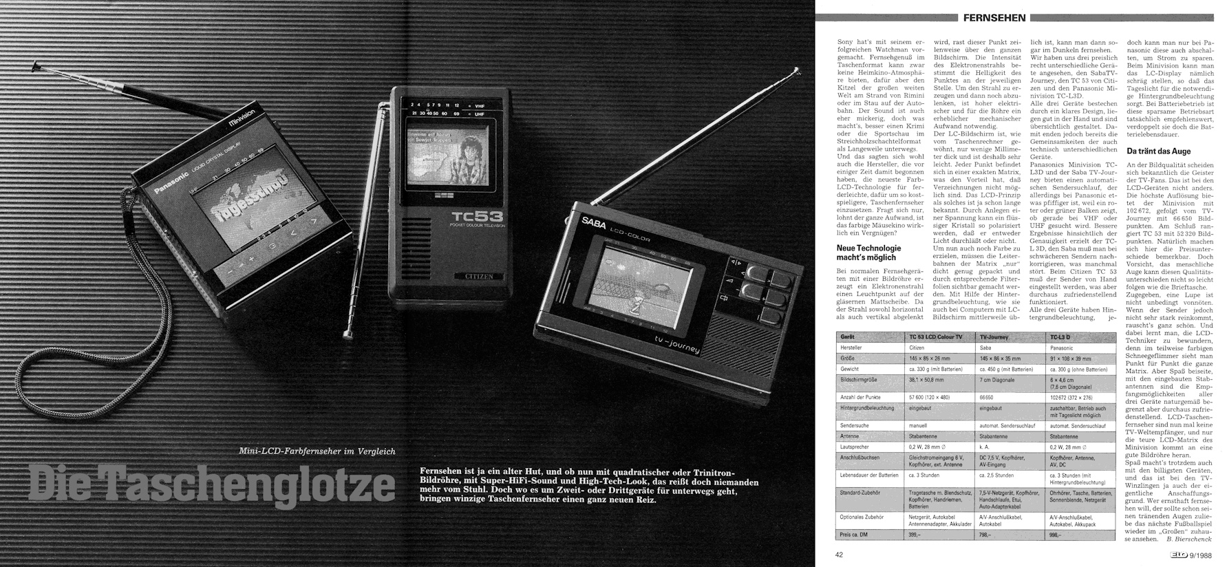 P.S. Das vermutlich erste Modell dieser 3-Zoll-Reihe aus dem Jahr 1986 fehlt mir leider noch in der Sammlung, es hört ebenfalls auf den Namen Pocket Watch. Die Modellbezeichnung sollte eigentlich Panasonic CT-301E lauten, aber offenbar wurde er so nie vermarktet. In Japan war er nachweislich als National TR-3LT1 unterwegs. Die Zeitschrift Electronics Today International hat im April 1986 und die Funk-Technik im Mai 1986 davon berichtet, ebenso die Modern Electronics im April 1986.