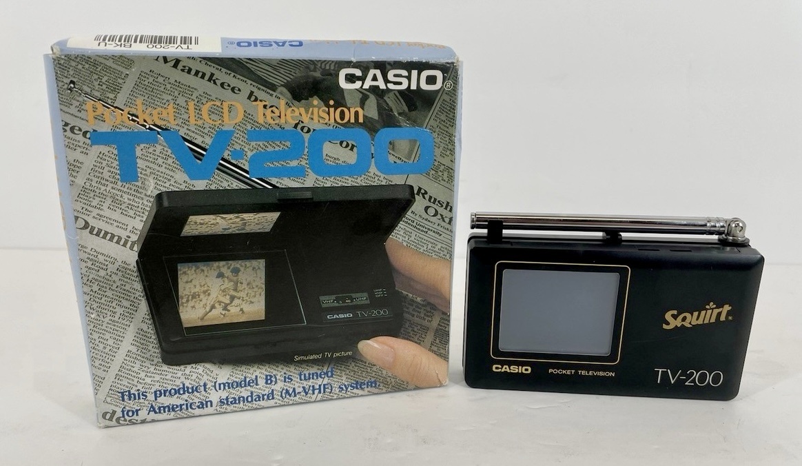 Noch etwas kleiner und leichter als der CITIZEN 06TA ist der CASIO TV-21. Damals, so um das Jahr 1985, der ideale "Begleiter für beschäftigte Leute". Genau wie beim CITIZEN wird das nur 30 * 40 mm kleine Bild durch einen Spiegel betrachtet, bei CASIO nennt man diese Konstruktion einen Solar-Projection-Screen. Die Bildqualität reißt ebenfalls niemanden vom Hocker, auch wenn die Bedienungsanleitung ein "High-Resolution-LCD" verspricht. Zudem besitzt der TV-21 keinen eingebauten Lautsprecher. Stattdessen muss ein spezieller Ohrhörer benutzt werden, der gleichzeitig als Antenne dient. Diese platzsparende Idee ist jedoch auch bei Fernsehgeräten nicht ganz neu, bereits ein Taschenfernseher-Prototyp von Motorola aus dem Jahr 1966 (!) verwendete diese Technik.
