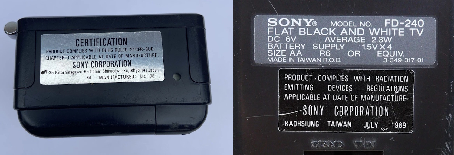Der FD-240 wurde nach meinen Unterlagen zwischen 1988 und 1989 gebaut, wiegt mit 4 Mignon-Akkus rund 390 Gramm und verbraucht im TV-Modus laut Typenschild 2,3 Watt. Das abgebildete Exemplar wurde im Juni 1988 in Japan hergestellt.