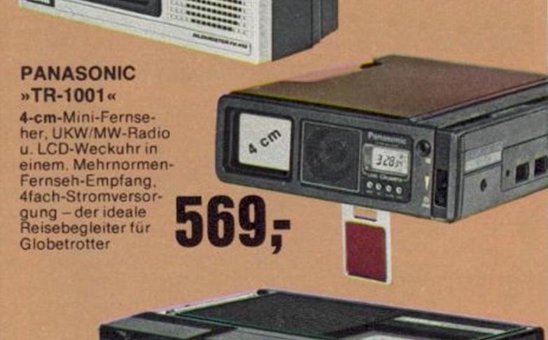 Kein Gerät für die Jackentasche, aber fraglos ein Stück Technikgeschichte: Der in der Mitte abgebildete Panasonic TC-30 gehörte Anfang der 80er Jahre zu den kleinsten Farbfernsehern weltweit. Der TC-30 ist die PAL-Version des Ende 1981 vorgestellten "japanischen" National Pana Color TH3-W3V, der es aufgrund seiner für damalige Verhältnisse unglaublichen kleinen Abmessungen sogar ins Guinness Buch der Rekorde schaffte. Ebenfalls für das Farbsystem NTSC konzipiert, war das Gerät in den USA als Panasonic CT-3311 erhältlich.
