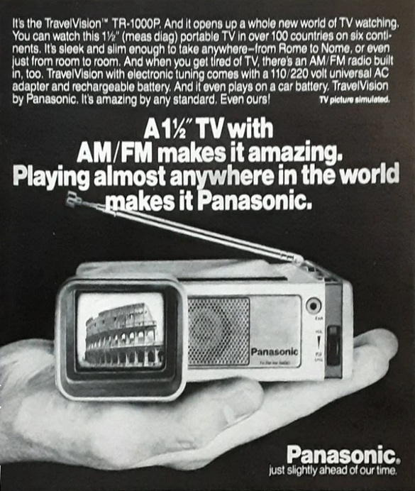 Just slighlty ahead of our time. Er gilt als der weltweit erste tragbare Fernseher im Taschenformat: Der National Panasonic TR-001 alias Mica 1 aus dem Jahr ... wenn ich das nur ganz genau wüsste. Leider befindet sich weder auf noch in dem Gerät ein sachdienlicher Hinweis auf das Herstellungsdatum. Unter Sammlern werden die Jahre 1970, 1971 und (komplett falsch) 1975 gehandelt. Tatsächlich aber waren schon Ende der 60er Jahre erste Lebenszeichen dieser Entwicklung "greifbar": Wie die Fachzeitschrift Funkschau berichtete, gab es Mitte 1968 bereits ein funktionsfähiges Muster eines Vorgängermodells (das aber vermutlich nie erhältlich war) und schon Ende 1969 hielten die Redakteure ein funktionsfähiges Exemplar des TR-001 in Händen. Anfang 1970 auch die Redakteure der US-amerikanischen Zeitschrift Popular Science. Dort wurde als voraussichtlicher Kaufpreis 299$ angegeben. Angeboten wurde der TR-001 nach meinen Unterlagen von 1970 bis 1972.