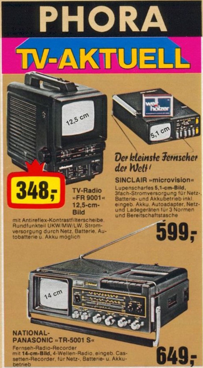 P.S. Eigentlich hätte bereits ein Jahr vorher, also schon 1982, ein "flacher" Fernseher von Sinclair in den Verkauf gehen sollen: Der Sinclair Microvision 2700 wurde (nur als Mockup) im Februar 1981 vorgestellt und hätte ein Jahr später (inklusive eingebautem UKW-Radio) zum Preis von nur 50 Pfund verkauft werden sollen. War aber irgendwie nix.